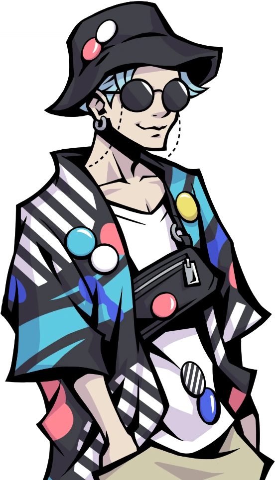 Aoi has pale skin and short messy light blue hair. He wears beige pants and a white shirt under a black jacket patterned with stripes and spots of white, blue, and pink. He wears a black bag around his neck, a black bucket hat, and black sunglasses with round lenses and a small chain. He accessorizes with round colorful pins all over his clothes.