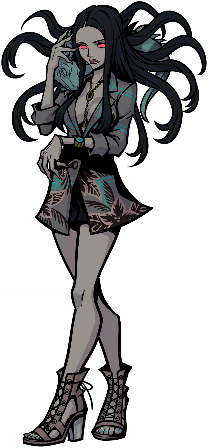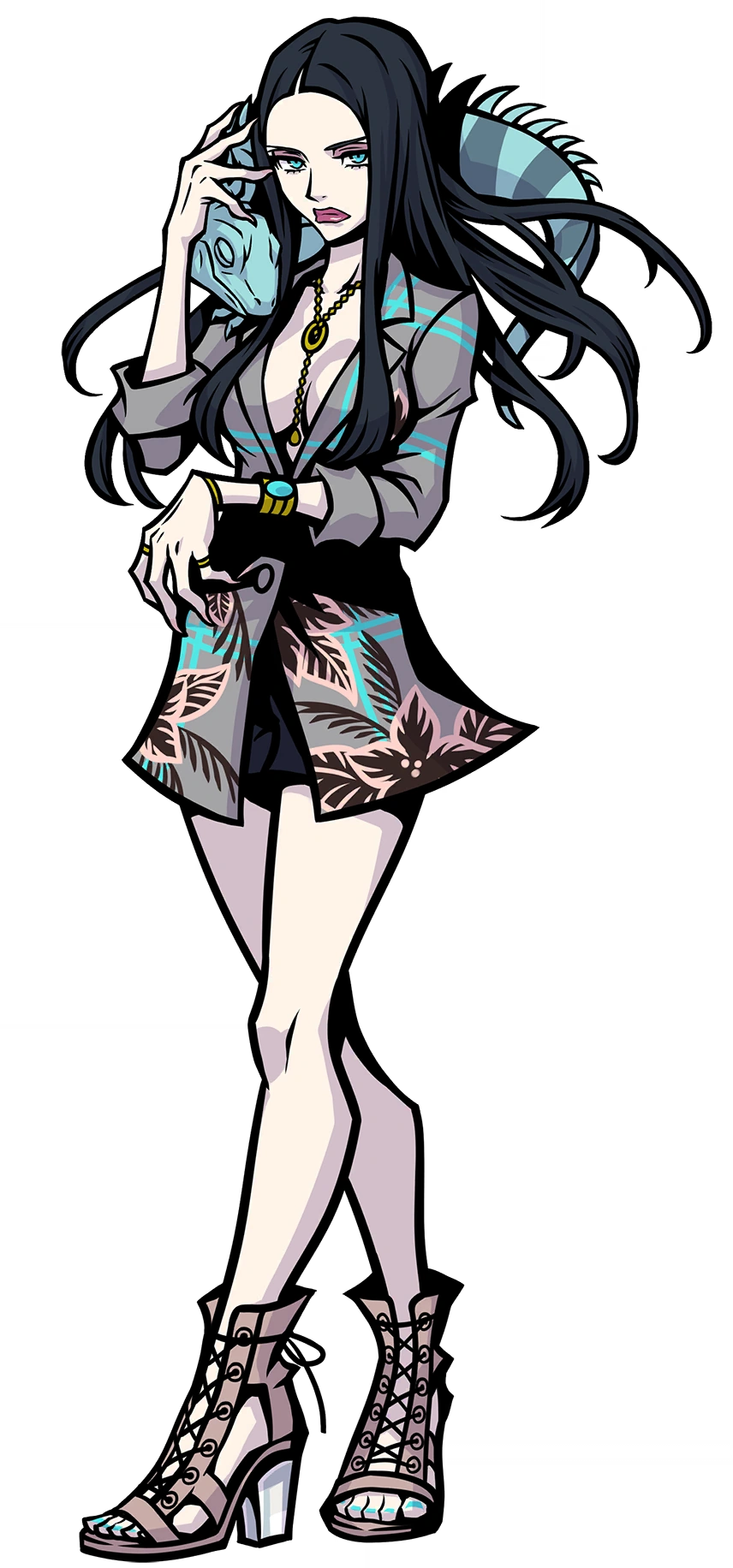 She wears a gray teal-lined and floral-patterned blouse, opened to reveal cleavage. She seems to wear either a black miniskirt or short shorts. She accessorizes with a gold necklace with a black stone at the center, as well as bracelets and rings on her left arm. Her fingernails are also quite long and her toenails are painted teal. She wears beige open-toe high heels. She has a pet iguana who rides on her shoulders. She is described by Shoka Sakurane as having a "mean RBF" (resting bitch face)[2].