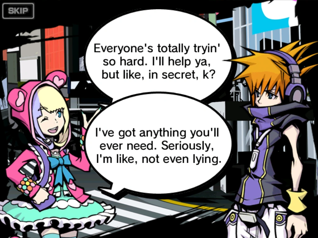 - "UGH. Can you, like, cool it with the third degree, sis? I've been erasing Noise and helping folks I see around town. I'm, like, literally doing so much! Okay? Wow. Like, harsh much? ...Anyway, regardless of what you might think, I'm, like, totez committed to saving this city."