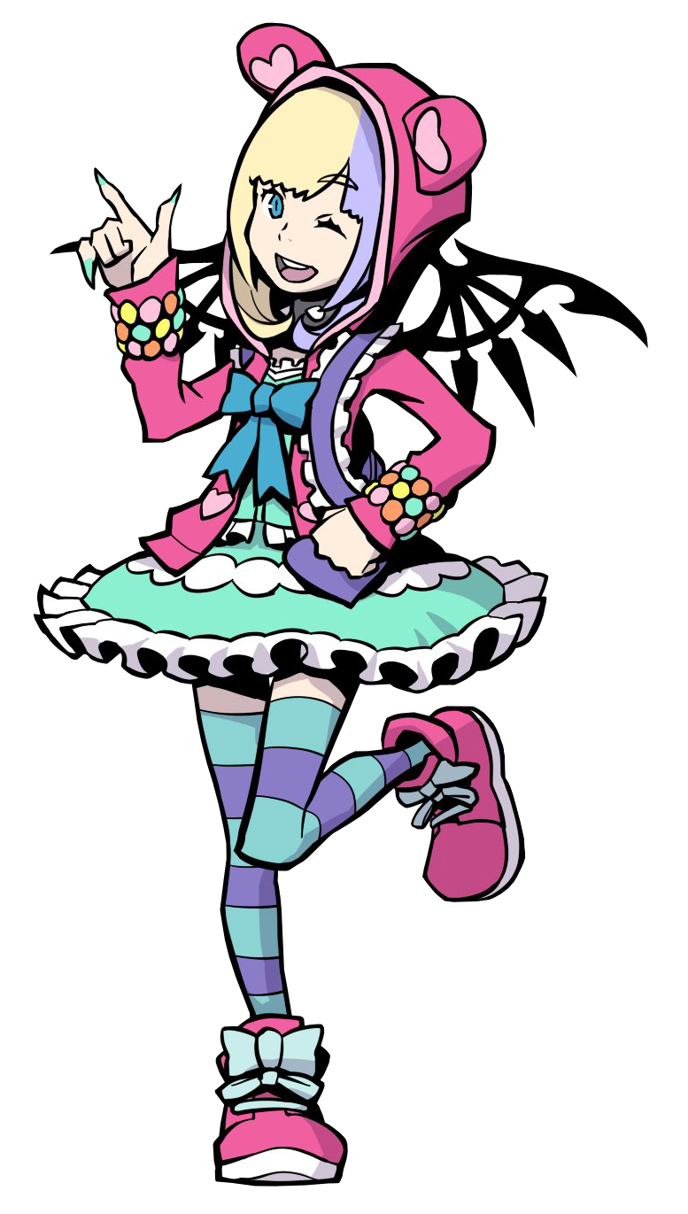 In NEO: The World Ends with You, Coco now wears a much more subdued (though still Harajuku-inspired) fashion style compared to her vibrant looks in The World Ends with You, but it's only a surface reinvention. Pitching herself as the most adorable Reaper-slash-fairy princess in all of Shibuya, she actually has little interest in her Reaperly duties and often spends her time in Harajuku, sometimes even wandering outside Shibuya. Despite her delicate appearance, she is actually quite cunning, deceiving others to help get her way—but she remains deeply loyal to her friends, such as Tsugumi.