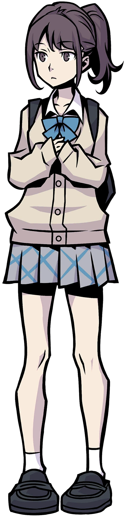Marino Orihara is a teenage girl with pale skin, brown hair styled into a ponytail and brown eyes. She wears a beige buttoned sweater over a white undershirt and wears a blue bow at her collar. She wears a short gray skirt with a thin lattice pattern in light blue. She has a black backpack, white socks, and black shoes.