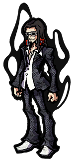 Never seen without his sunglasses or large red headphones, Megumi Kitaniji cuts a surprisingly imposing figure as the Conductor of the game. He's sinister and keeps a level head as his subordinates disobey him and attempt to break the rules of the Game. At the same time, his attitude toward the players is that "nothing is sacred." He typically takes a "wait-and-see" stance with the other Reapers, being more the type to lead from the shadows rather than take charge from the front lines, though he will do so if necessary. He has a general dislike and mistrust of people and seems to love the city of Shibuya more than anything else. He has a very manipulative personality and tries to bend others to his will has shown many times throughout the game.