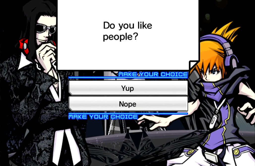 - The answer that Neku chooses in response to Kitaniji's question near the end of the game determines some minor dialogue changes in the aftermath.