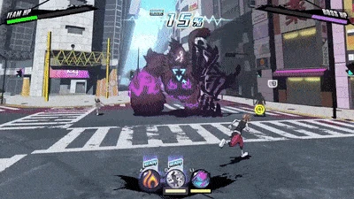 Similarly to the original game, the player has access to a variety of psychs, all of which are new. As in the original game, pins have a limited number of uses before they briefly shut down to "reboot", although unlike the original, pins now boot instantly at the start of battles. Just like health was shared between partners in the original game, health is shared between the team. Characters not controlled by the player fight under AI control, although if the player stops attacking to avoid an enemy's area attack the AI characters will do so too. This is often necessary, as the AI characters take equal damage to the controlled character unless they're equipped with Threads that have the Stalwart Ally ability active.