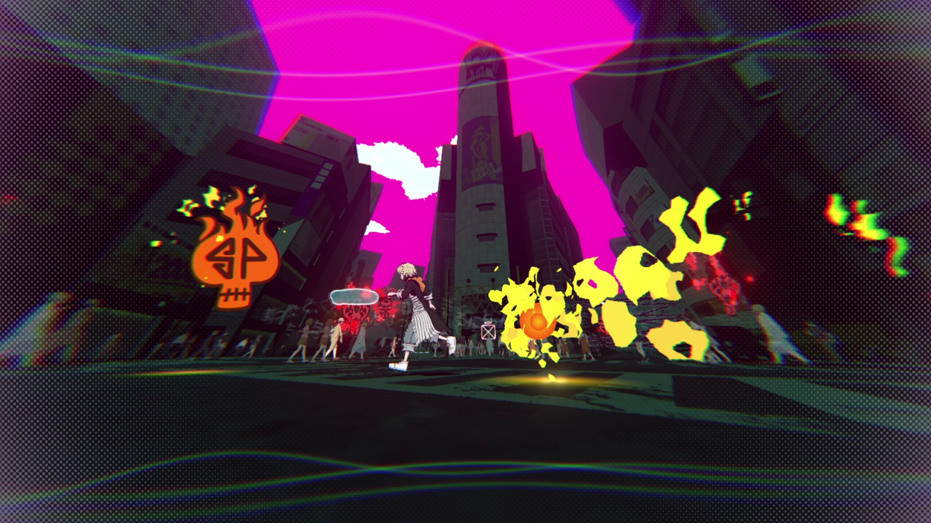 The Scramble Slam is a citywide turf war that has teams of Players vying for control of areas in Shibuya. An area can be claimed by erasing the orange Turf Noise or taking down the rival team members in an area. There are three Scramble Slams in the game. They do not play as actual tactical area control games, but as story devices; however, during a Scramble Slam an additional scoring mechanism is added to combat.