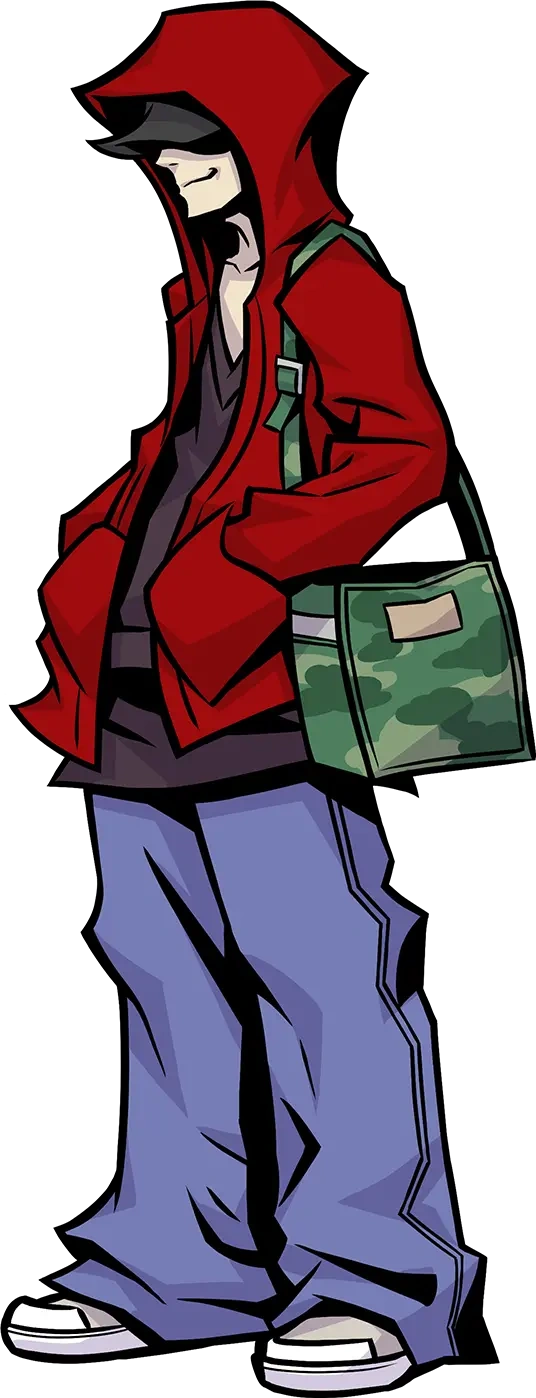 Harrier Reapers are mid-ranking Reapers who are permitted to act independently (within a few constraints) in order to erase Players during the game. Usually, the Game Master will specify when and where Harriers may act. Due to the rule that Reapers may not normally attack players directly, Harriers must summon Noise to attack the players. Harriers, like Support Reapers, can easily be identified by Players, all Harriers wear the same attire, consisting of a black pull-over hoodie with the hood up, the hoodies all have white markings on the sleeves and front. they also wear maroon bandannas as masks that hide their features, they wear dark green pants that slouch over their shoes like Support Reapers with a wallet chain, and carry around their waists a brown bag. They have dark red sneakers with white soles.