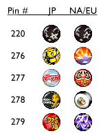 The Japanese version had four pins (Polytan, Gemaga, Nindori-kun, and Famitsu) that were references to Japanese gaming magazines (Dengeki, Gemaga, Nintendo Dream, and Famitsu respectively). Their icons and descriptions were changed to Fuji Yama, Daruma, Sushi, Shinobi in the NA/EU version. The stats of the pins did not change.