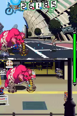 The bottom screen is used to control Neku. Various touches of the bottom screen make Neku perform specific actions and move, depending on what pins he has equipped. These can range from short slides on the enemy to tapping at the air to shoot projectiles, but only 6 pins at maximum can be equipped at once. The top screen, containing Neku's current partner, is controlled by pressing the directional buttons, or the control pad, in specific directions to select a pathway of arrows. What lies at the end of each arrow varies by partner, however. If the right set of commands are met, the player gets a star, which contributes towards a Fusion attack.