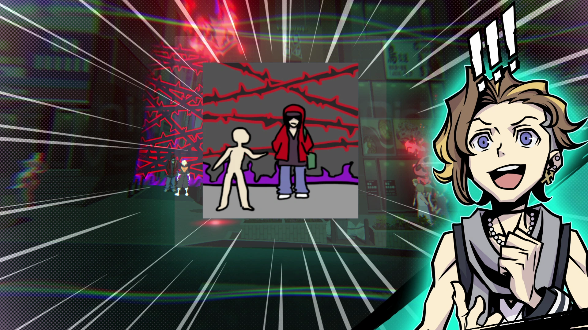 Initially thinking the colorful explosions and fighting must be some sort of movie set, the two realize that the danger might be more real than they thought. Rindo is suddenly struck with a vision of Shibuya in ruins, though he snaps back to the present moment. He and Fret attempt to run away, and Rindo feels a sense of deja vu. As they flee, Fret appears to be crushed by a truck thrown by a stray Noise (however, this seems to contradicts the game's logic, and it is unclear if Fret simply phased through it due to being in the UG). As a result, Rindo screams in shock and horror as he is suddenly transported to a green, void-like space. After this, time rewinds, and Rindo is once again standing with Fret in front of the fight. This time, he guides Fret in the opposite direction of the truck and is able to prevent him from getting crushed. After this, they enter the Reapers' Game more directly.