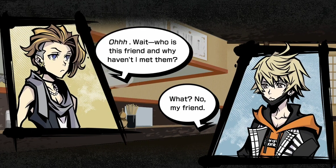 - Fret scans someone in the RG while looking for "Neku" on Week 2, Day 2. In the English localization, he says they had saw someone "acting kinda sus" and that they might be an "impostor" or "Neku". While the word "sus" itself can be traced as far back as the 1920s, when used in conjunction with "impostor", this instance of Fret's dialogue is more than likely a reference to the video game Among Us, where players must find suspicious players who might be impostors. As the Japanese version does not reference Among Us or the idea of there being an "impostor", this can be seen as somewhat spoiling a plot twist.